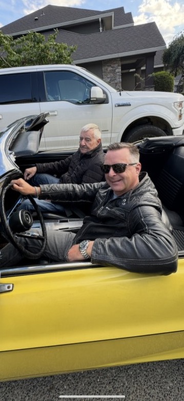 In the second photo, the joy of the project comes through even more clearly. The two of us sit side-by-side in the restored interior, the black vinyl seats contrasting with the bright bodywork. The steering wheel and classic dash layout remind you that this car was built for pure, analog driving pleasure. You can almost hear the rumble of the V8 echoing off the pavement.
